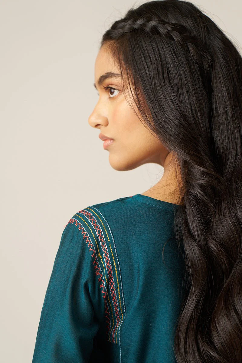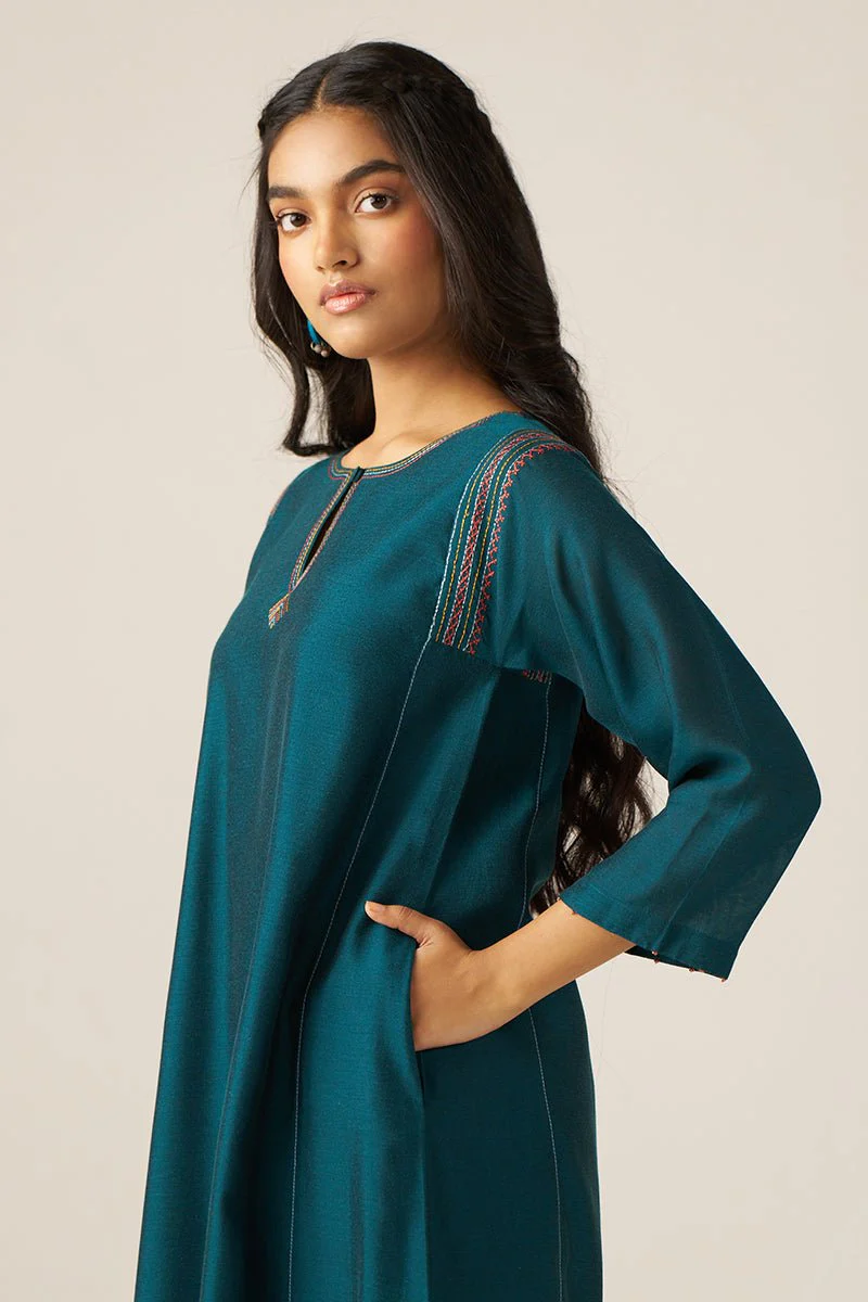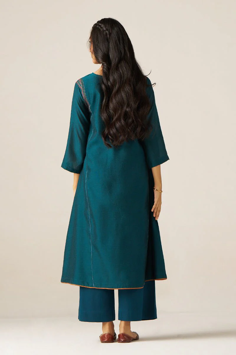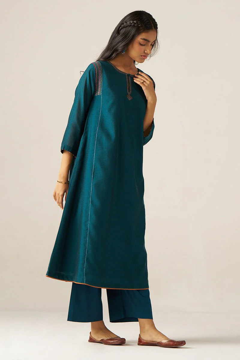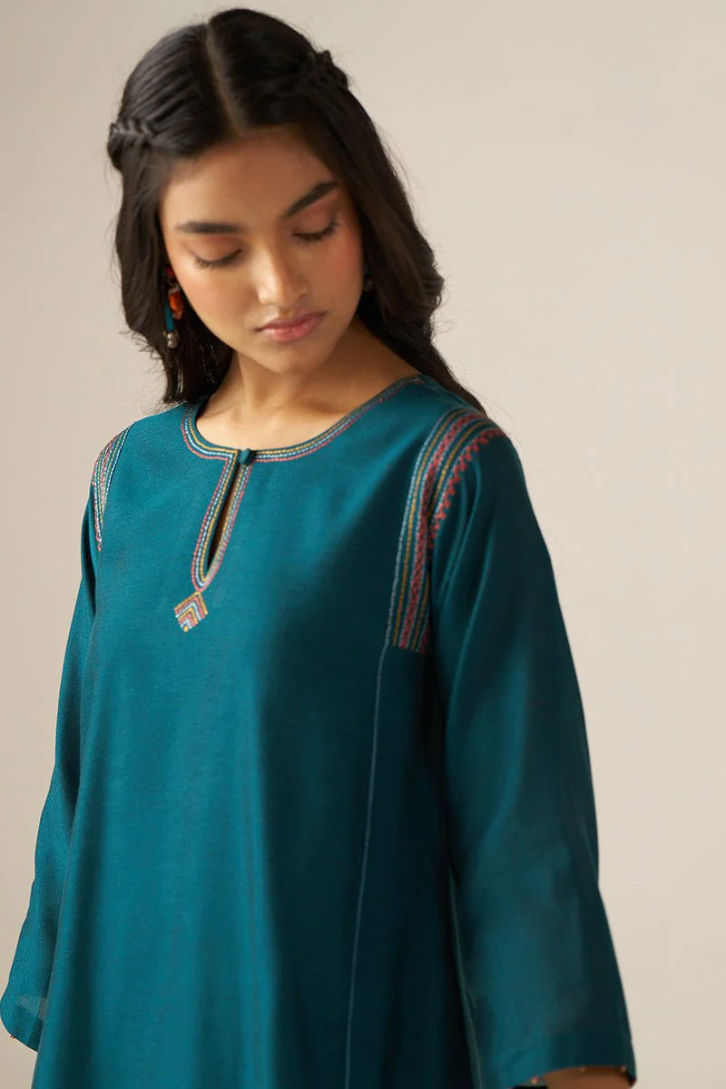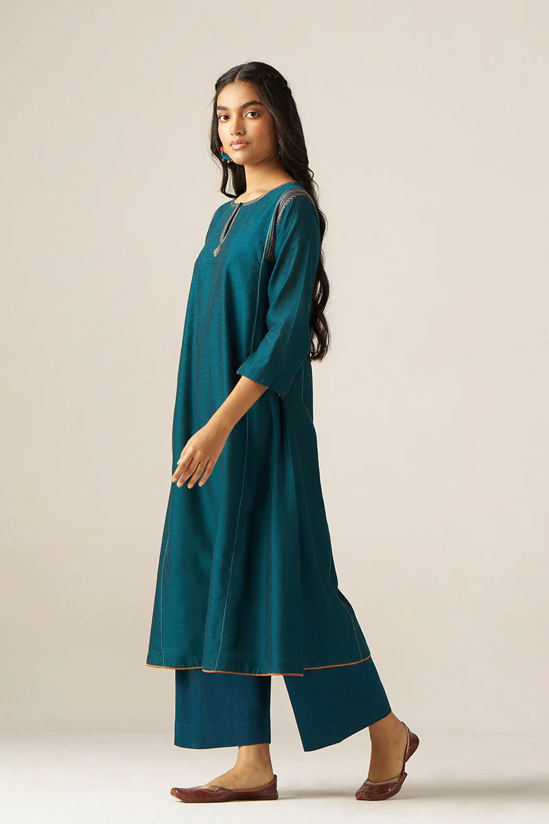 Fabrics. - Top- Matka Silk. - Bottom- Cotton Satin. Product Description. - Delicate thread embroidery on Silk kurta. paired it with pallazzo. - Component: Top and Bottom. - Fit: A-Line. - Color: Balsam Blue. - Model height is 5’7'' she is wearing size xs. Wash Care. - Dry Clean Only. Note : Product color may slightly v