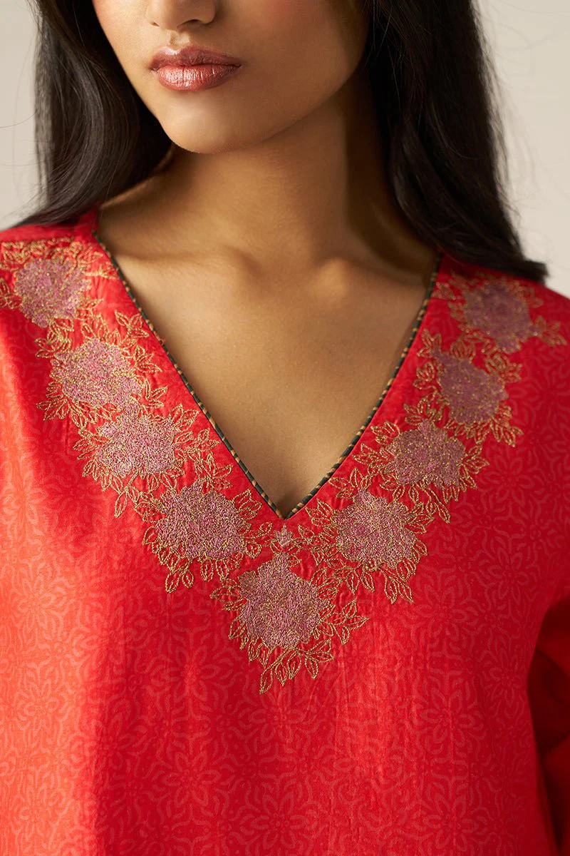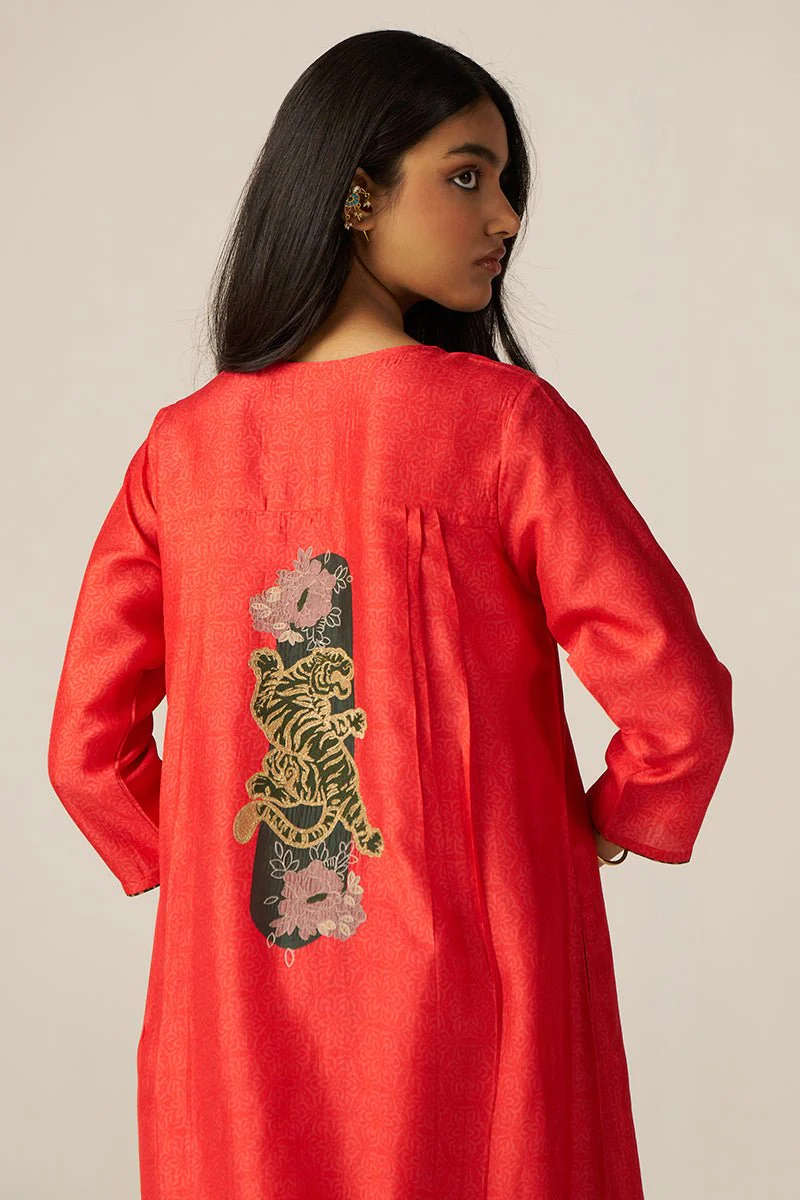 Fabrics. - Top- Bemberg Raw Silk. - Bottom- Viscose Muslin Silk. Product Description. - Delicately outlined the motives of tiger and flower with zari, to make beautiful intricate pattern. paired with flowy muslin bottom. - Component: Top and Bottom. - Fit: Regular. - Color: Bittersweet Red. - Model height is 5’7'' she
