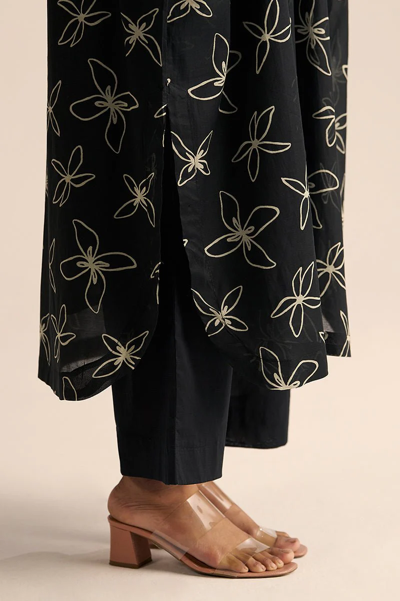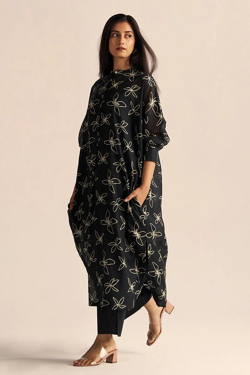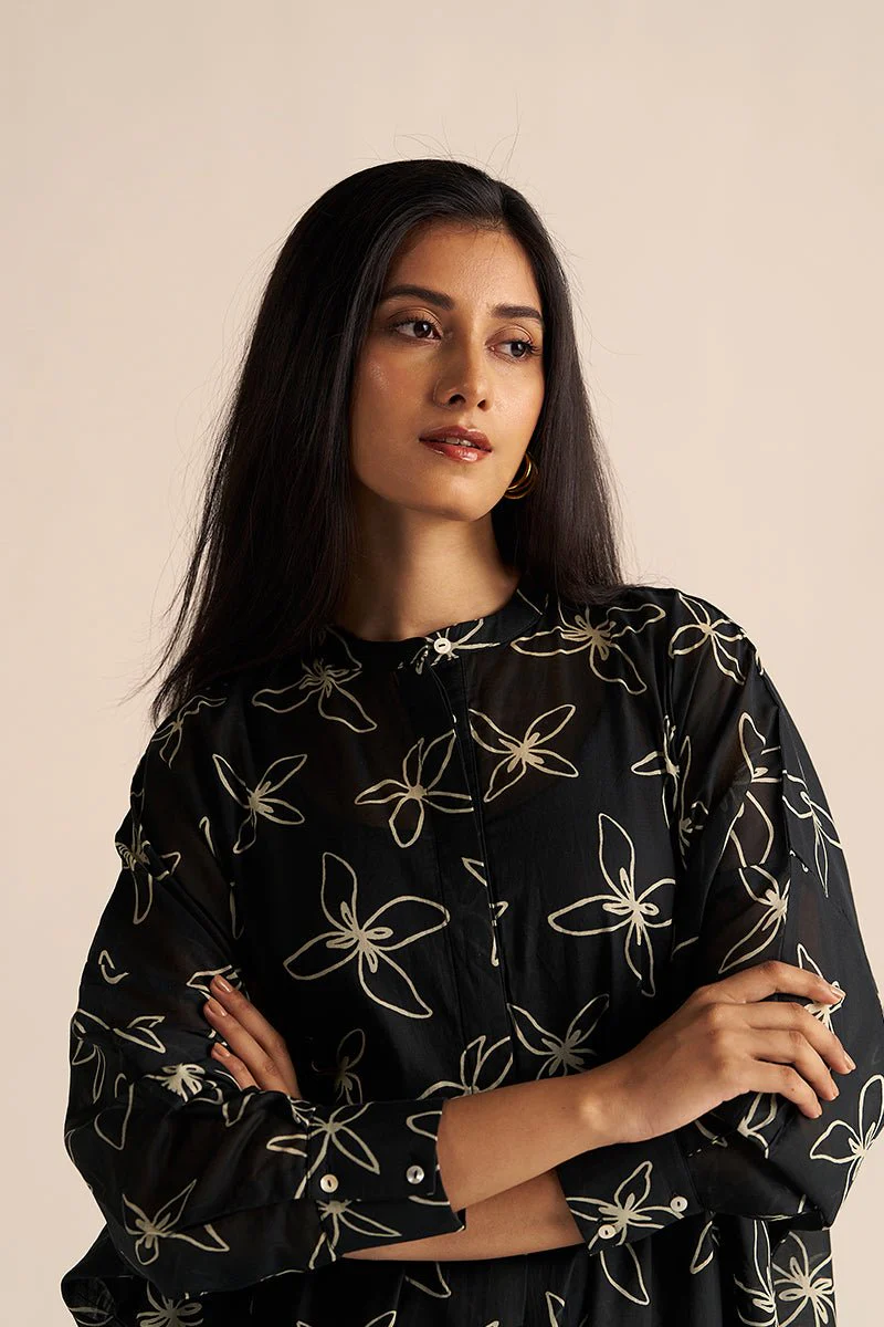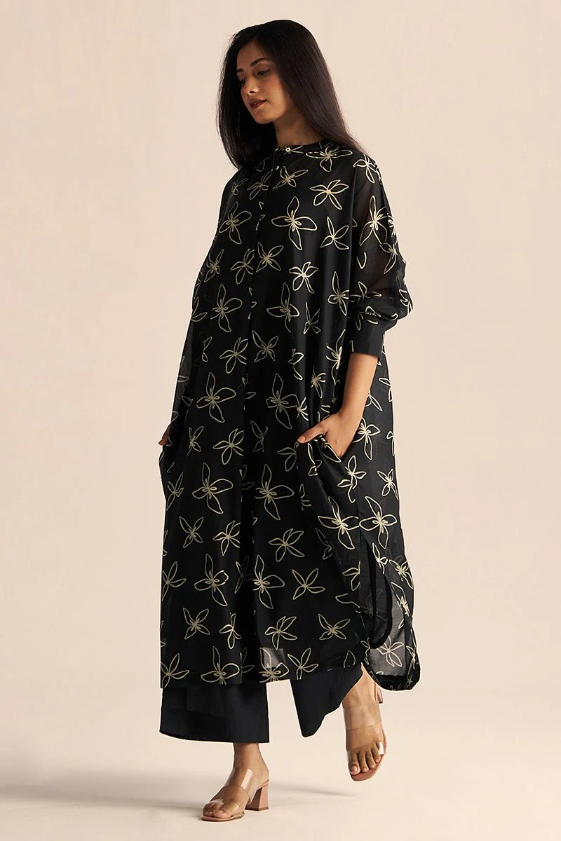 Fabrics. - Top- Mul Chanderi. - Bottom- 100% Cotton. - Slip- Voil Cotton. Product Description. - This set includes floral print anti-fit kurta with solid wide leg cotton bottom. - Component: Top, Bottom and Slip. - Fit: Anti-Fit. - Color: Black. - Model height is 5’11'' she is wearing size s. Wash Care. - Do Not Wring.