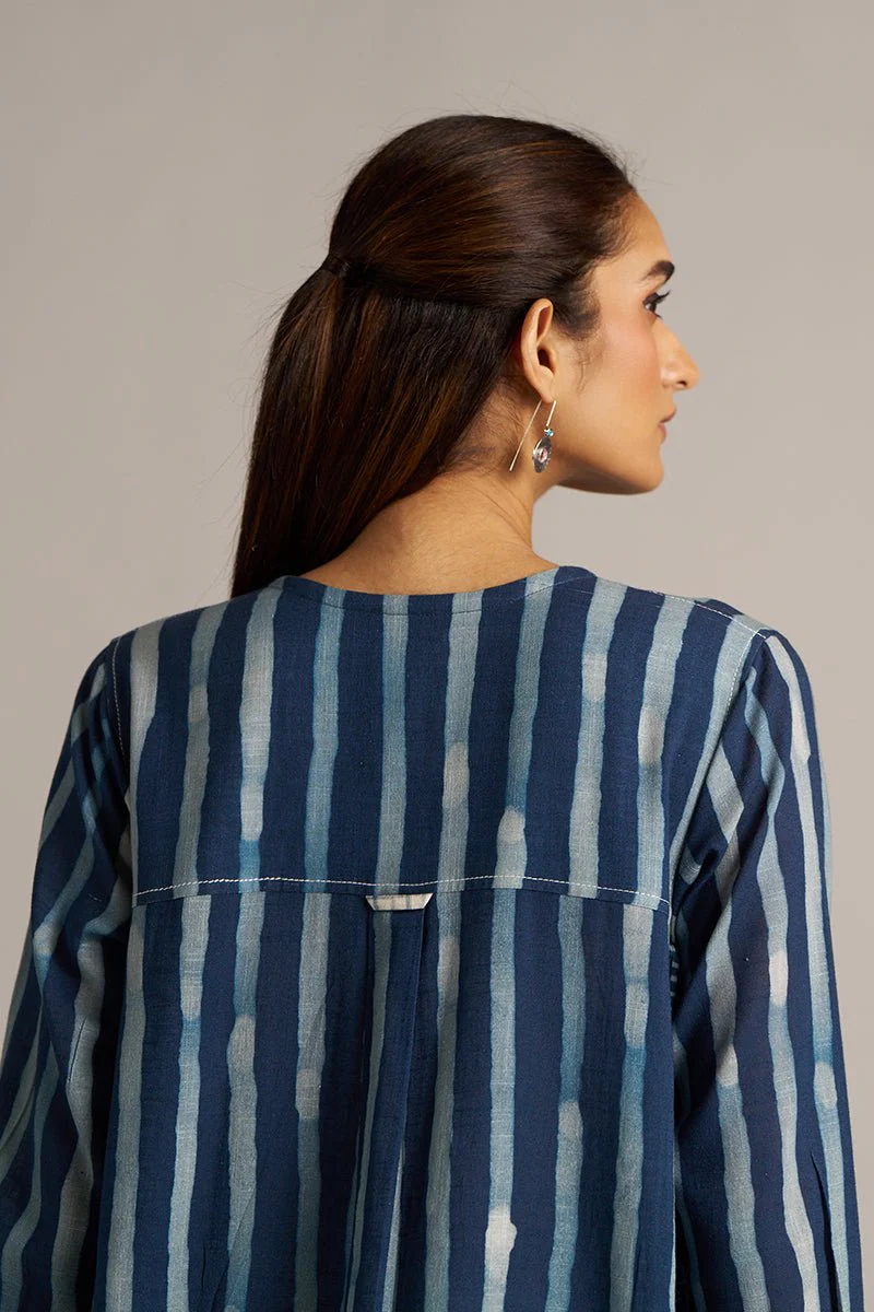 Indigo Blue Stripe and Check Print Linen Co-ord Set