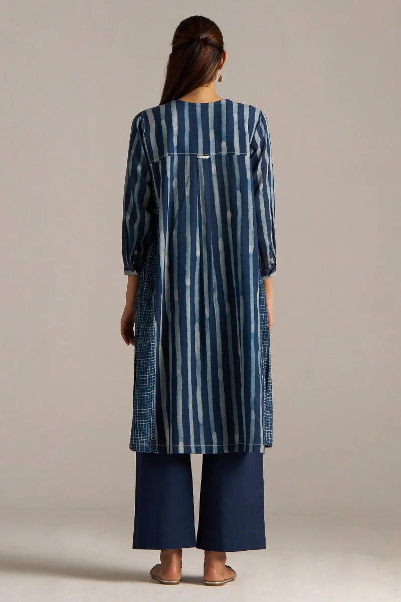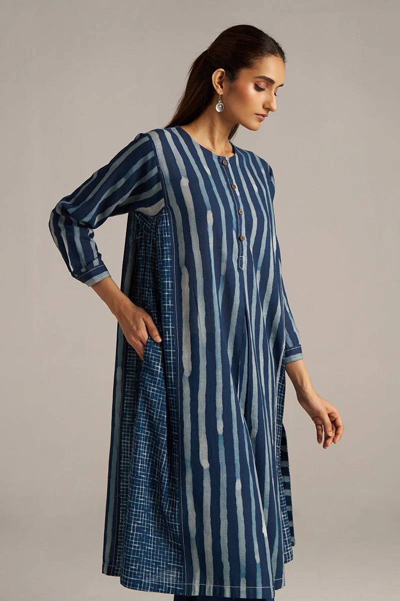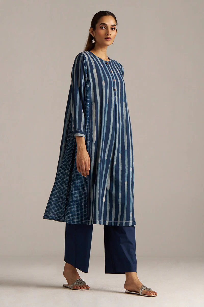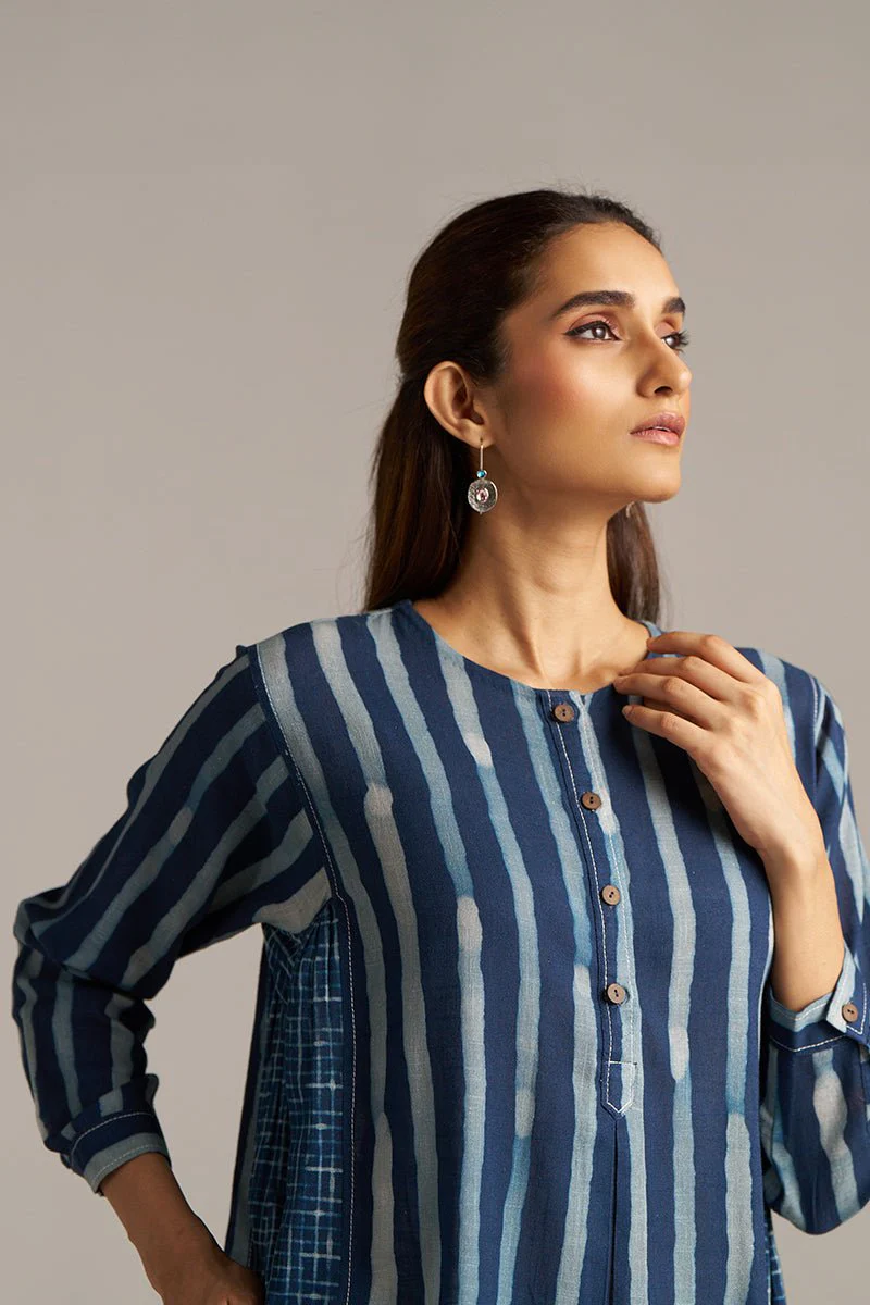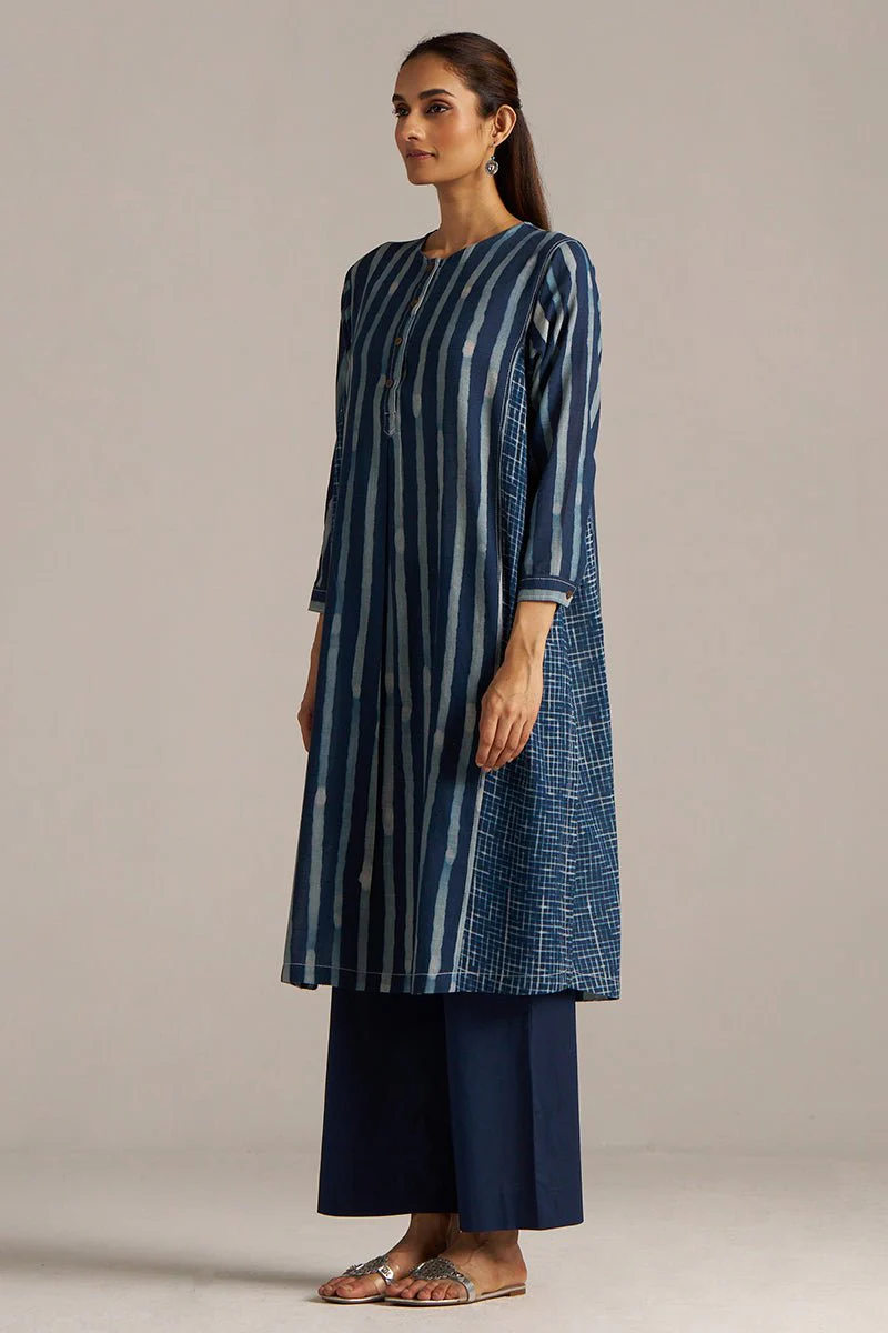 Fabrics. - Top- Cotton Linen. - Bottom- 100% Cotton. Product Description. - This set includes combination of stripe and check prints kurta with wooden button detail, slight gathers on sides, with cotton solid wide leg bottom. - Component: Top and Bottom. - Fit: Loose Fit. - Color: Indigo Blue. - Model height is 5’11''