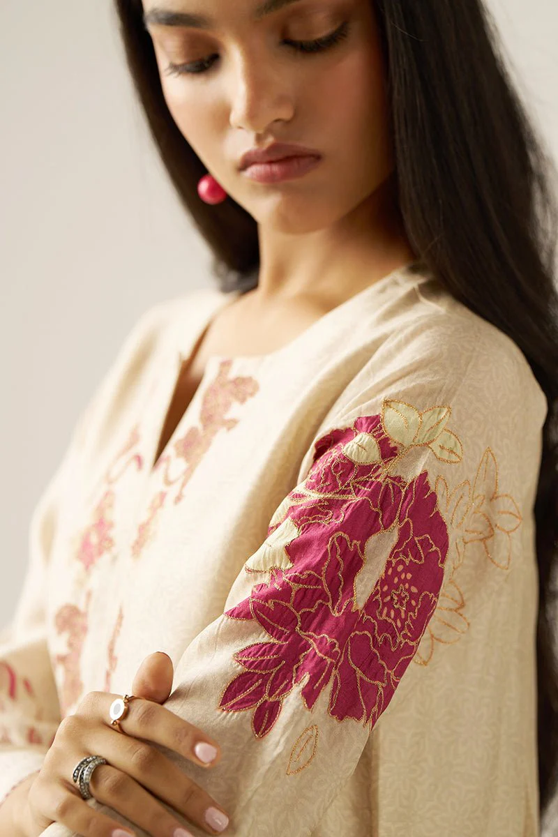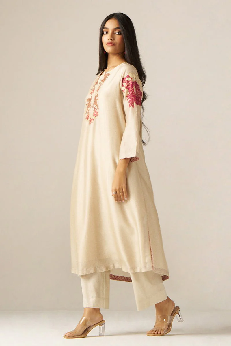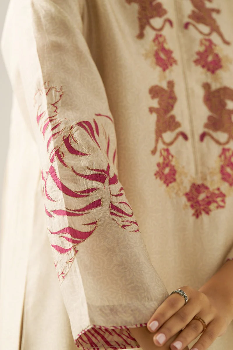 Fabrics. - Top- Bemberg Raw Silk. - Bottom- Viscose Muslin Silk. Product Description. - Delicately outlined the motives of tiger and flower with zari, to make beautiful intricate pattern. paired with flowy muslin bottom. - Component: Top and Bottom. - Fit: Regular. - Color: Whitecap Gray and Beige. - Model height is 5’